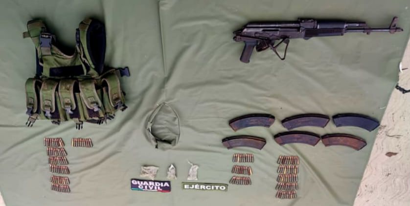 Al ahora indiciado le decomisaron un arma de fuego calibre 7.62X39 milímetros, 150 cartuchos útiles, seis cargadores y tres envoltorios con hierba verde y seca, al parecer marihuana.