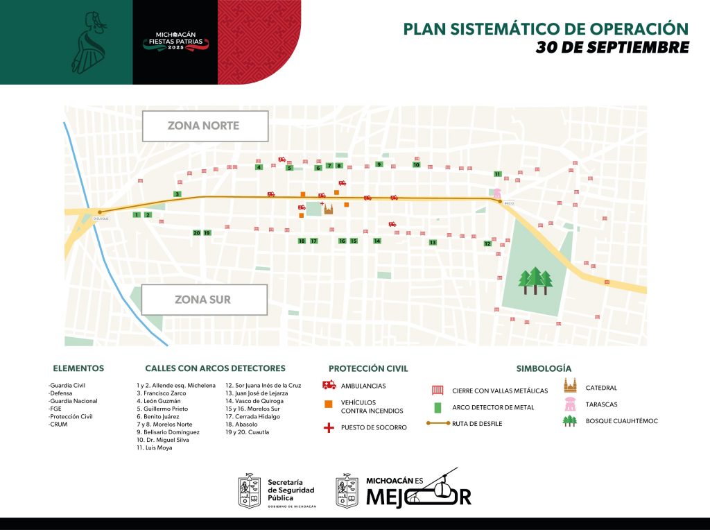 En el marco del 260 Aniversario del Natalicio de José María Morelos y Pavón, la Secretaría de Seguridad Pública (SSP) establecerá un operativo integral de vigilancia, para garantizar el orden durante el desfile cívico militar del 30 de septiembre, con la habilitación de 20 puntos de acceso para el público que asista.