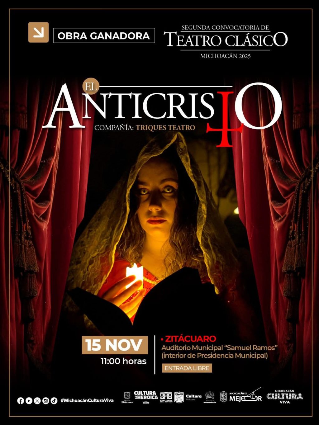 Morelia, Michoacán, 13 de noviembre de 2025.- La Secretaría de Cultura de Michoacán (Secum) invita a la presentación de “El Anticristo”, puesta en escena de Triques Teatro, ganadora de la segunda edición de la convocatoria Teatro Clásico Michoacán 2025. La función se llevará a cabo el 15 de noviembre a las 11:00 horas, en el Auditorio Municipal “Samuel Ramos”, dentro de la Presidencia Municipal de Zitácuaro, con entrada libre.