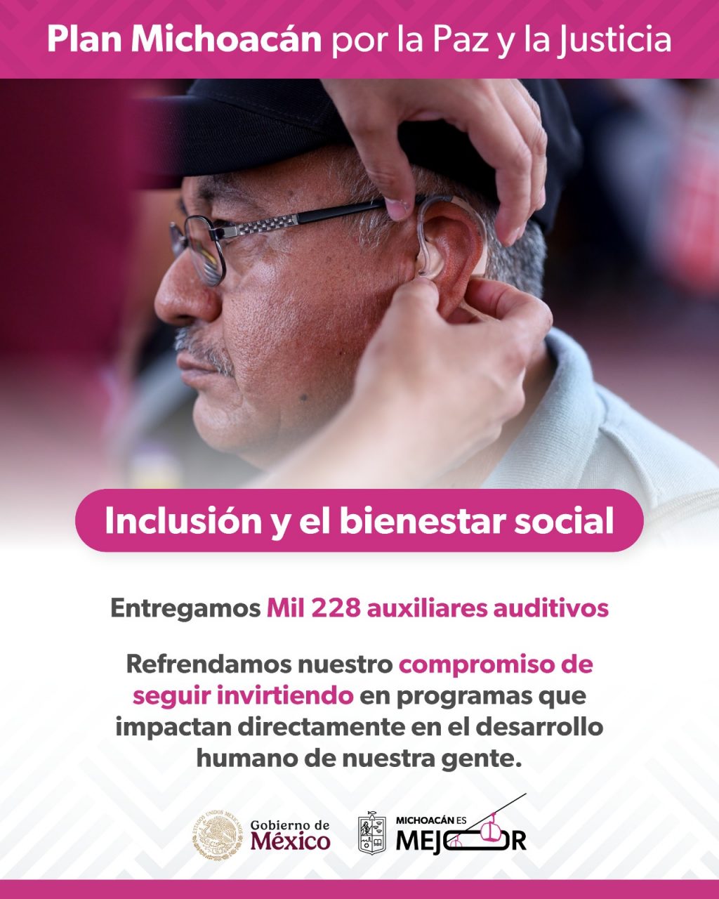 La Secretaría de Salud de Michoacán (SSM), en seguimiento a las acciones prioritarias del Plan Michoacán por la Paz y la Justicia, realizó la entrega de mil 228 auxiliares auditivos con el objetivo de mejorar significativamente la calidad de vida e impulsar la inclusión social de los beneficiarios.