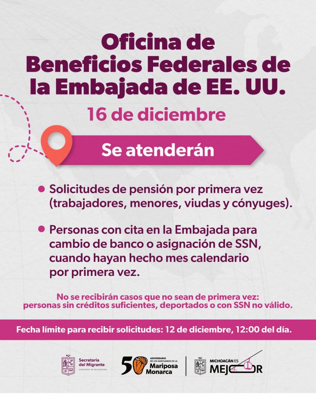 La Secretaría del Migrante (Semigrante) informa que el próximo 16 de diciembre se contará con la visita del personal de la Oficina de Beneficios Federales (FBU) de la Embajada de los Estados Unidos en México, con el propósito de fortalecer la atención a las y los michoacanos que buscan acceder a una pensión del Seguro Social estadounidense.
