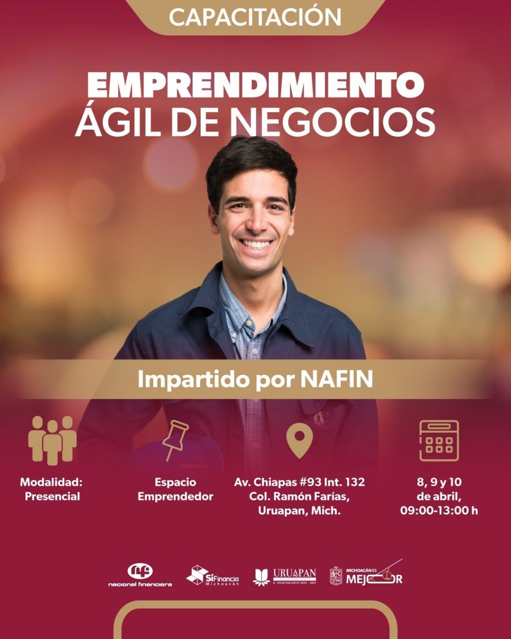 El Sistema Integral de Financiamiento para el Desarrollo de Michoacán (Sí Financia), en coordinación con Nacional Financiera (Nafin), impartirá el programa de profesionalización “Emprendimiento ágil de negocios”, dirigido a empresas y personas emprendedoras de Uruapan, informó el director general de la institución, Gabriel Gutiérrez Aviña.